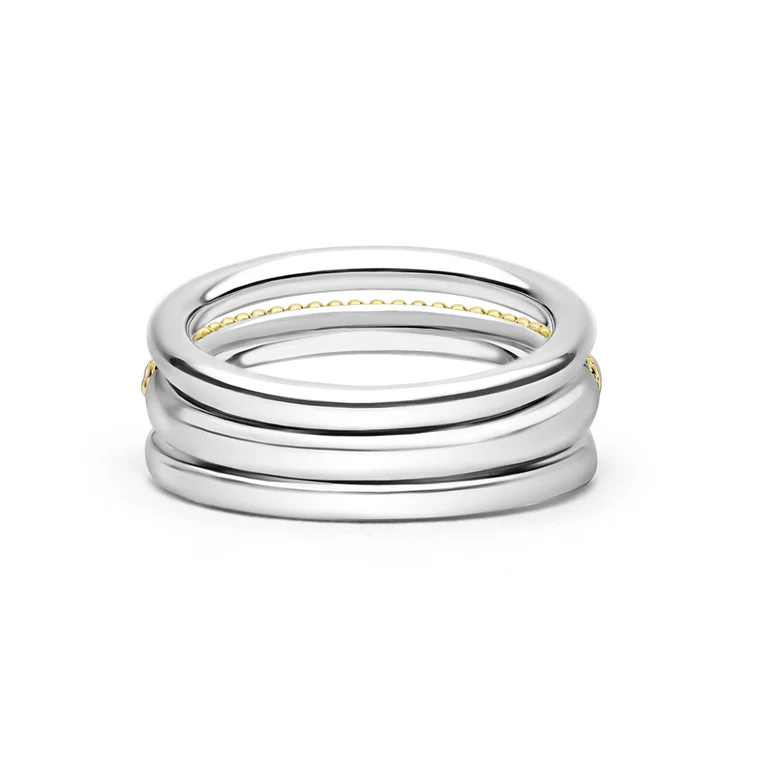 A striking three-row ring featuring LAGOS’s signature Caviar beading design. The two-tone aesthetic combines sterling silver with 18K yellow gold for a bold yet elegant visual texture. -